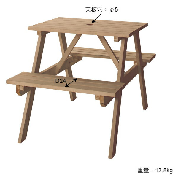 item spec サイズ ■本体:W=750×D=1,200×H=755mm ■座面の高さ:SH=450mm ■座面の奥行:D=240mm ■パラソル用穴:Φ50mm 材質 ■天然木(杉)・水性ラッカー塗装 色 ■ライトブラウン・ホワイト 商品説明 ■重量:12.8kg ■パラソル用穴付 ■お客様組立品・輸入品 ■梱包サイズ:W=1,220×D=500×H=110mm テーブルとベンチチェアが1つになった、カフェ風スタイルのテーブル&ベンチ。